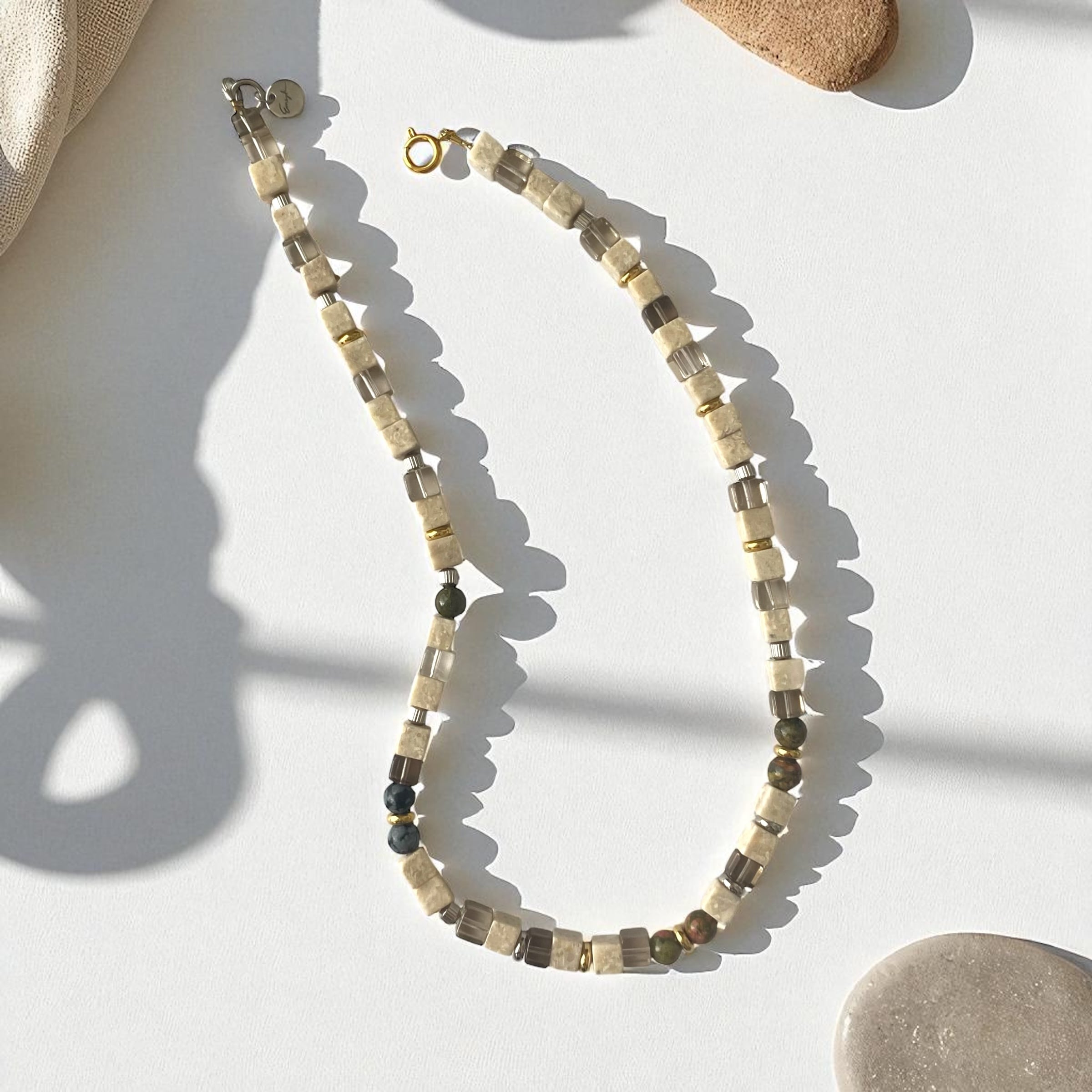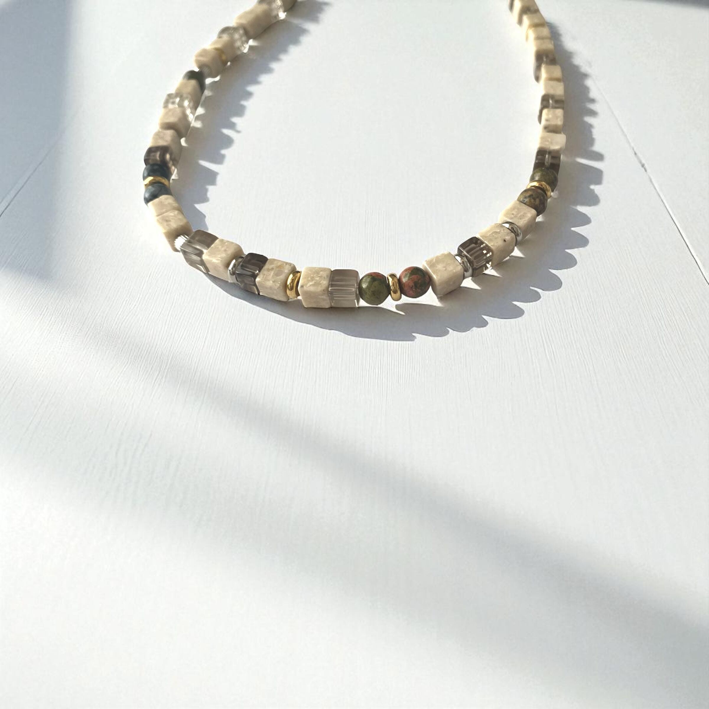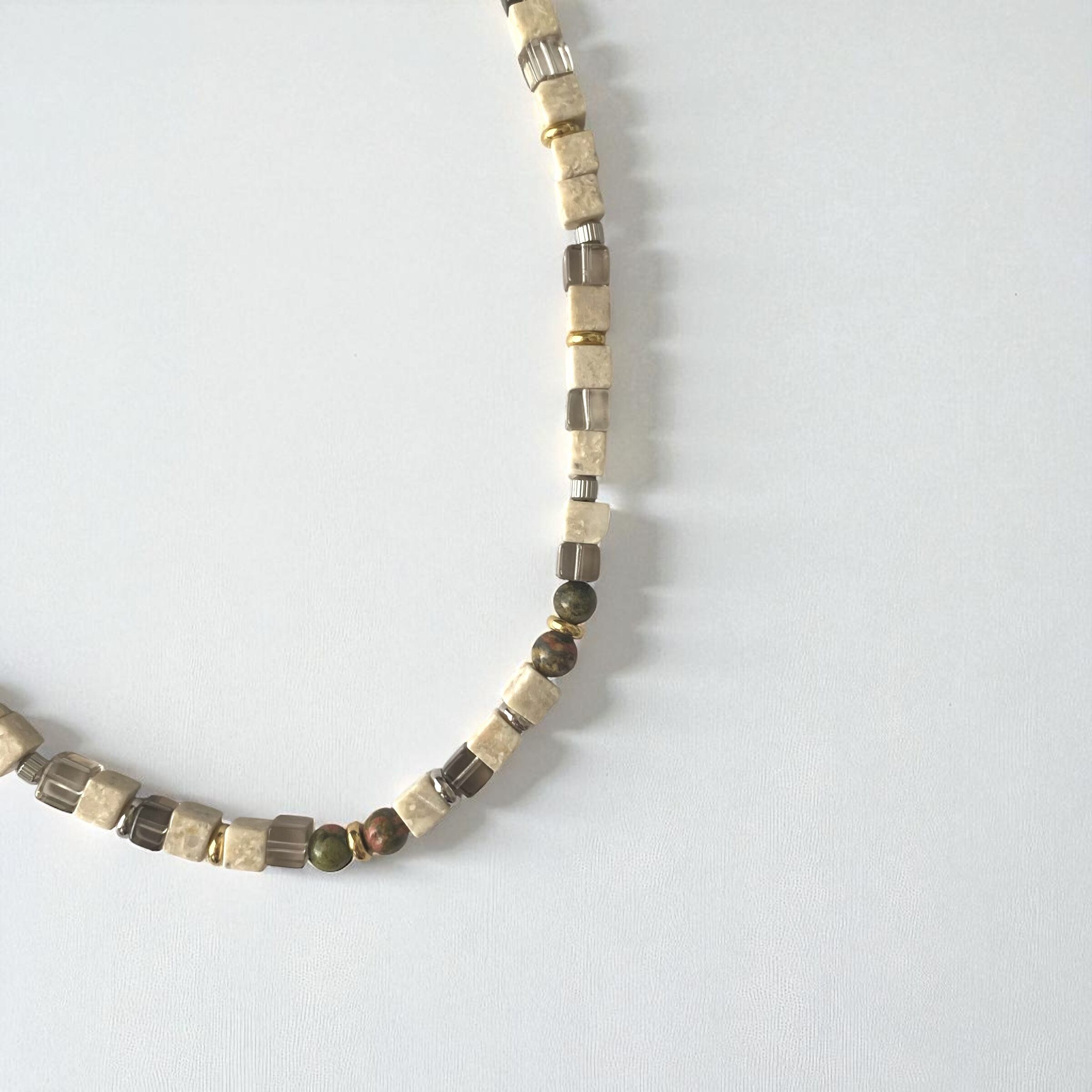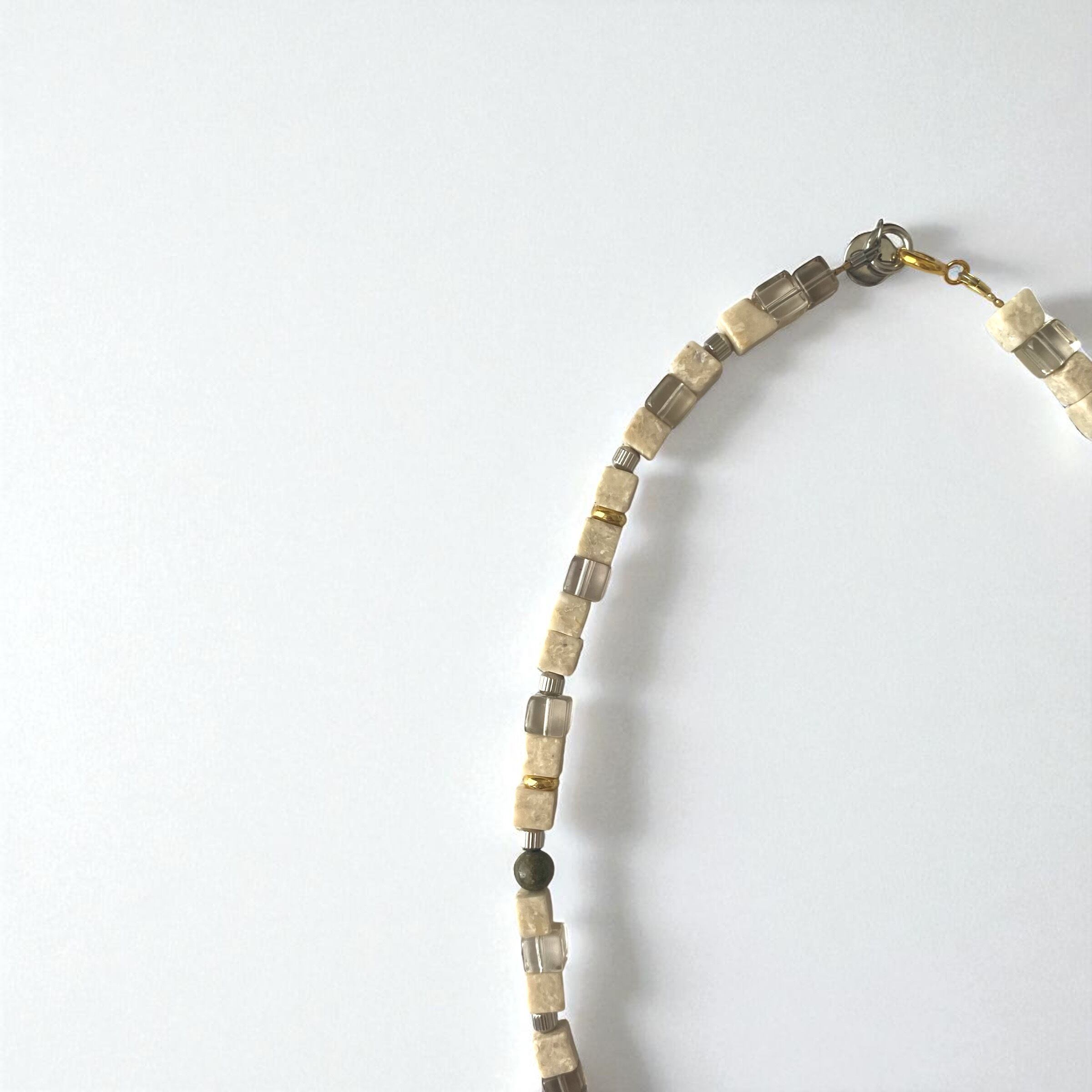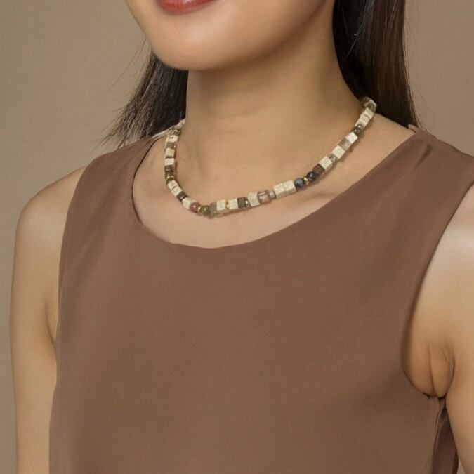 キューブ型のリバーストーンがなんともかわいいネックレスです。