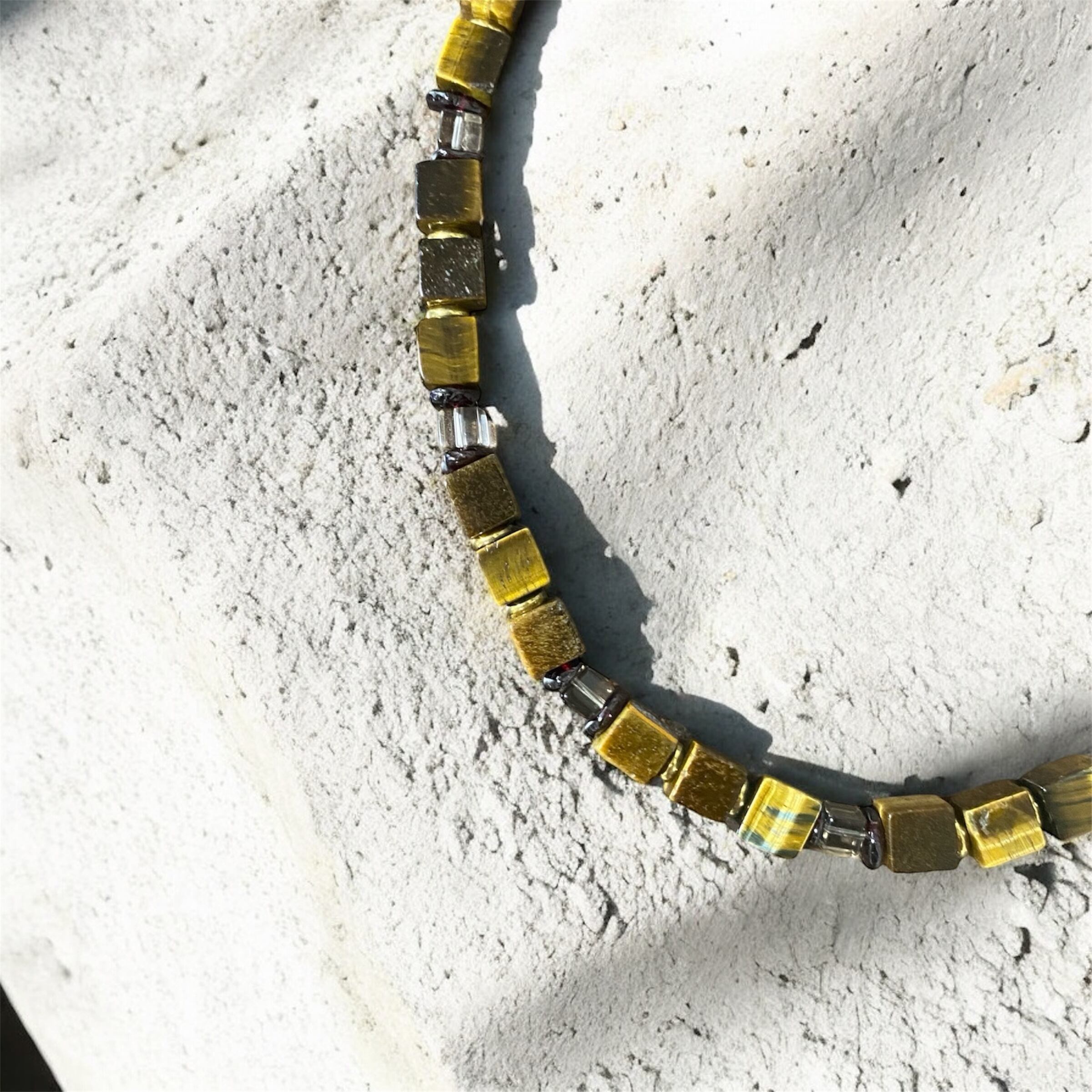 キューブ型のタイガーアイのステンレスパーツネックレス