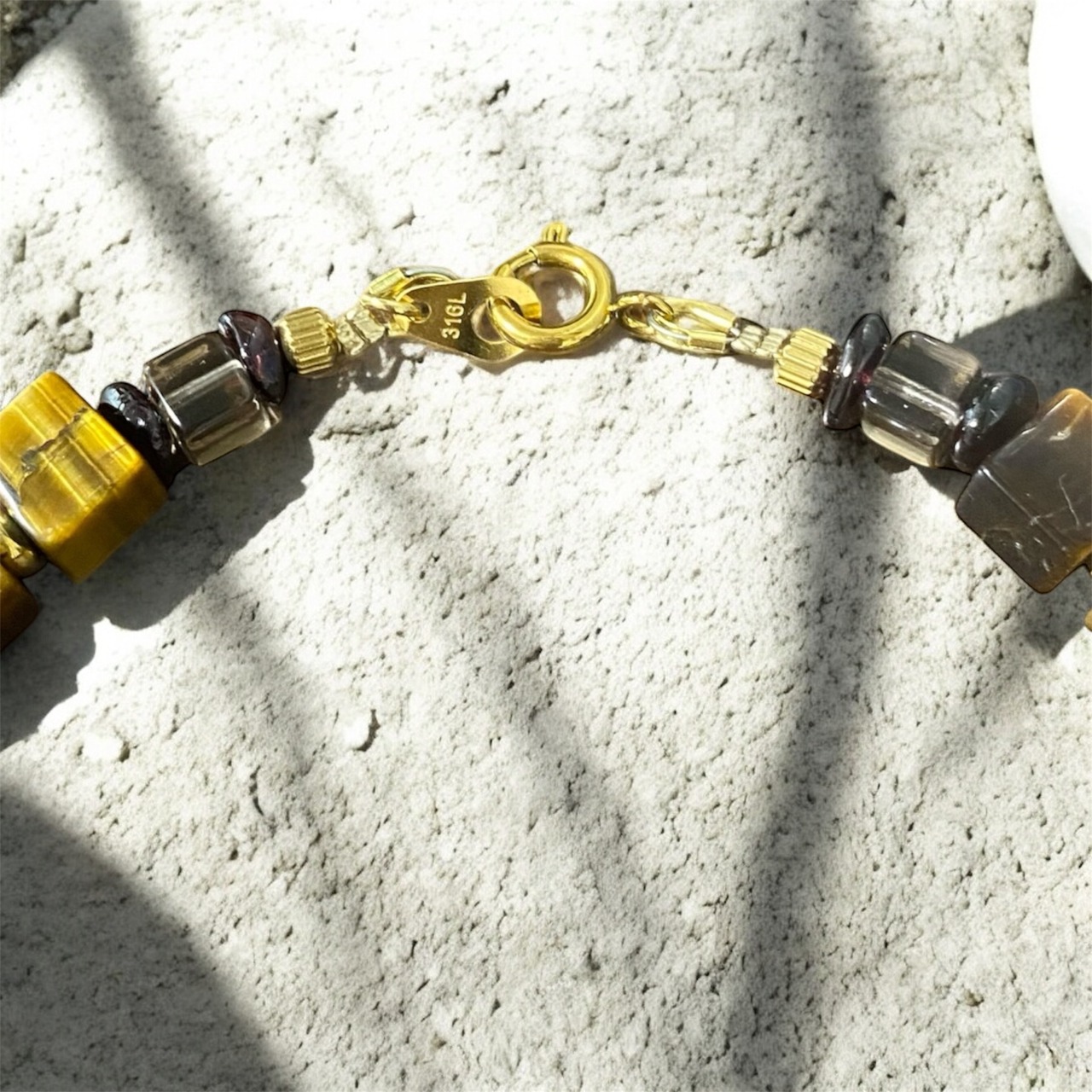 天然石のガーネットやスモーキークォーツを使用。