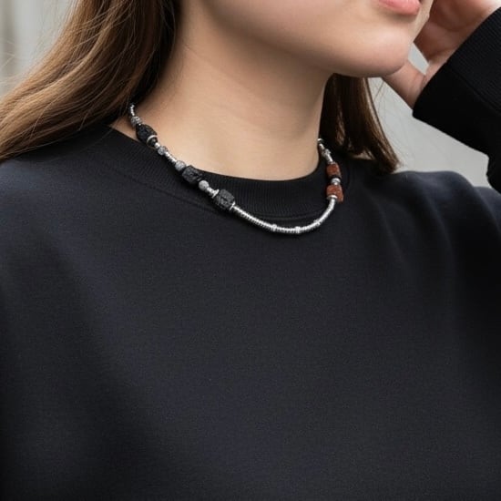 溶岩石(黒色)とステンレスメタリックビーズを使用した